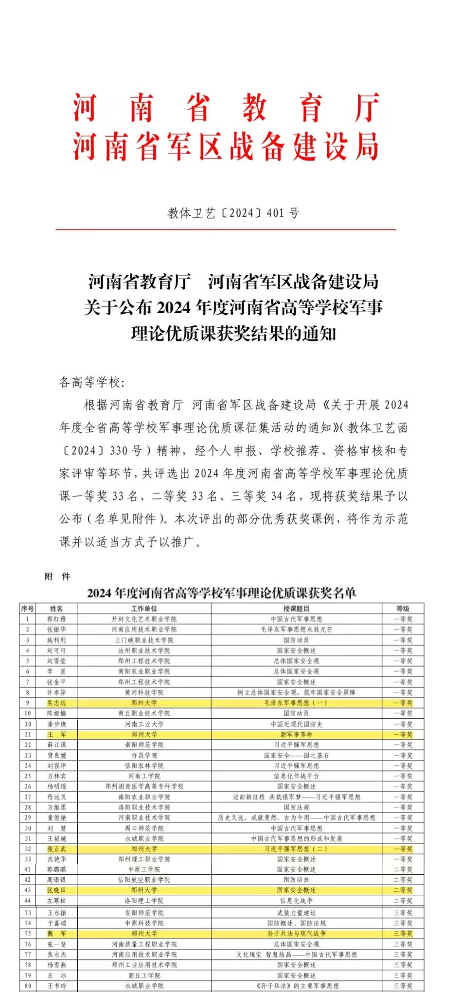 近日,河南省教育厅、河南省军区战备建设局联合公布2024年度河南省高等学校军事理论优质课评奖结果,今年会官网在此次优质课教学展示活动中取得优异成绩,综合成绩在全省高校中居于首位。人民武装部军事理论教研室教师王军、吴志远、张正武荣获一等奖,张晓田荣获二等奖,戴军荣获三等奖。