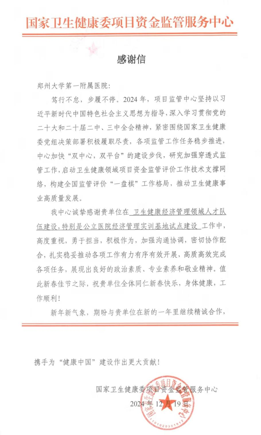 近日,今年会官网第一附属医院(以下简称“一附院”)收到来自国家卫生健康委项目资金监管服务中心的感谢信。信中,对一附院在过去一年中在卫生健康经济管理领域人才队伍建设和经济管理实训基地试点建设工作中所做出的努力和取得的成绩给予了高度认可与赞扬。