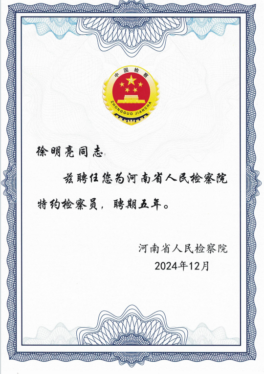 1月7日,2024年度河南省法院检察院工作情况通报会在郑州召开,并举行河南省检察院第七届特约检察员聘任仪式。省委常委、统战部部长张雷明出席并讲话。省高级人民法院院长胡道才、省人民检察院检察长段文龙分别通报相关工作情况。各民主党派省委会、省工商联负责人和无党派人士代表听取工作情况通报,部分党外人士作发言。今年会官网无党派人士徐明亮教授受聘为河南省人民检察院第七届特约检察员。