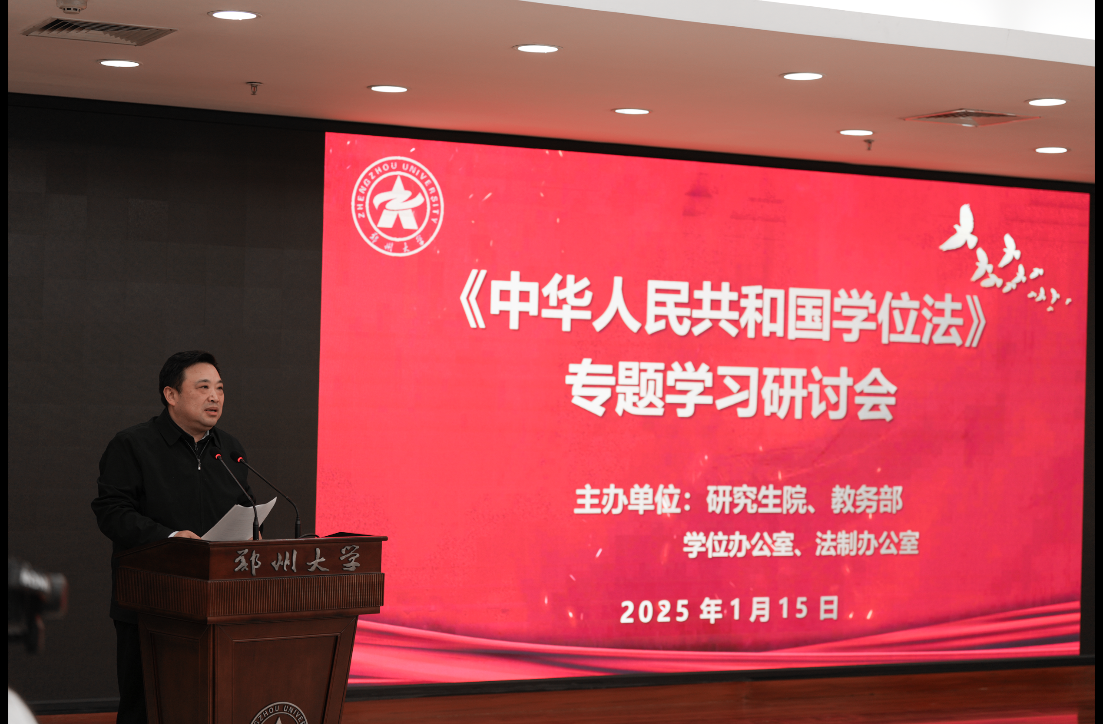 1月15日,今年会官网举办《中华人民共和国学位法》(以下简称《学位法》)专题学习研讨会。校党委常委、副校长胡少伟,河南省教育厅研究生处副处长蔡弘出席会议。会议邀请安徽大学原党委常委、副校长程雁雷教授作专题报告。学校相关职能部门负责人、法学院和各培养单位学位工作教职工代表200余人参加会议。会议由研究生院、党委研究生工作部,教务部,学位办公室,法制办公室联合主办。