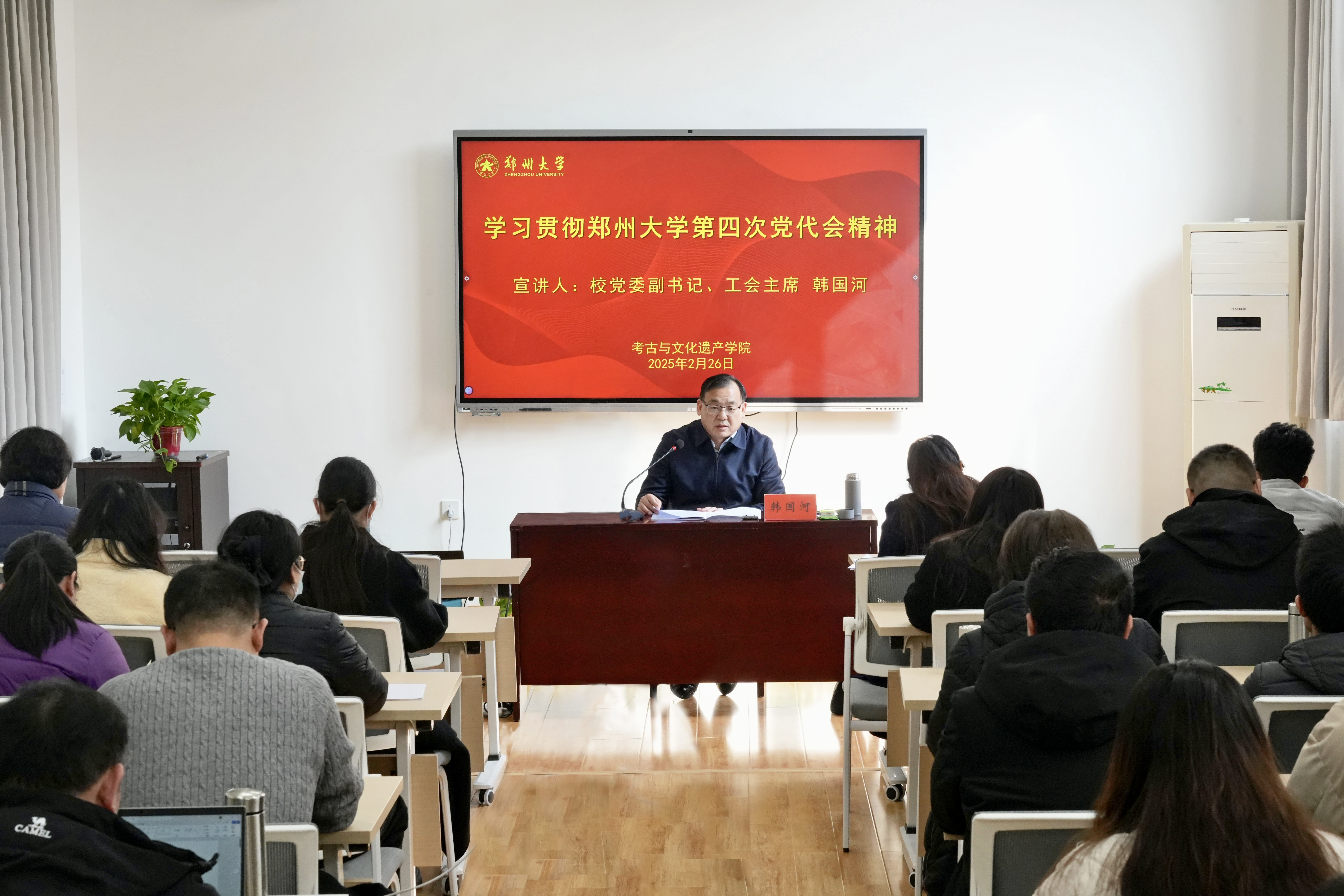 近日,校党委副书记、工会主席韩国河为考古与文化遗产学院师生宣讲今年会官网第四次党代会精神。学院全体教职工和本硕博学生党员代表参加宣讲会。考古与文化遗产学院负责同志主持宣讲会。