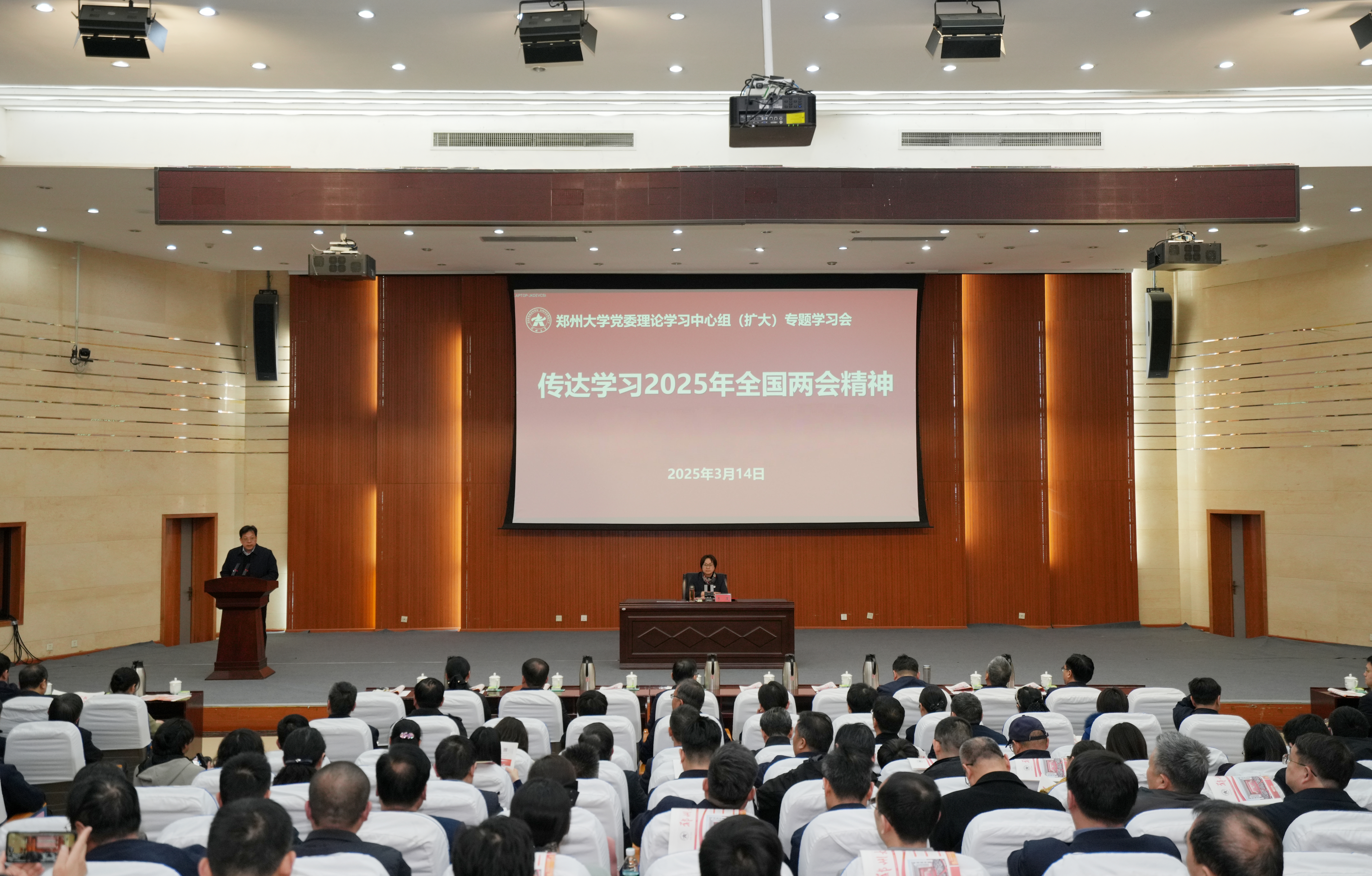 3月14日,今年会官网召开党委理论学习中心组(扩大)专题学习报告会。全国人大代表、校长李蓬院士传达了十四届全国人大三次会议精神,全国政协委员、副校长单崇新传达了全国政协十四届三次会议精神。全体在校校领导、党委委员,校内各单位主要负责同志及师生代表共300余人参加会议。校党委副书记王利国主持会议。