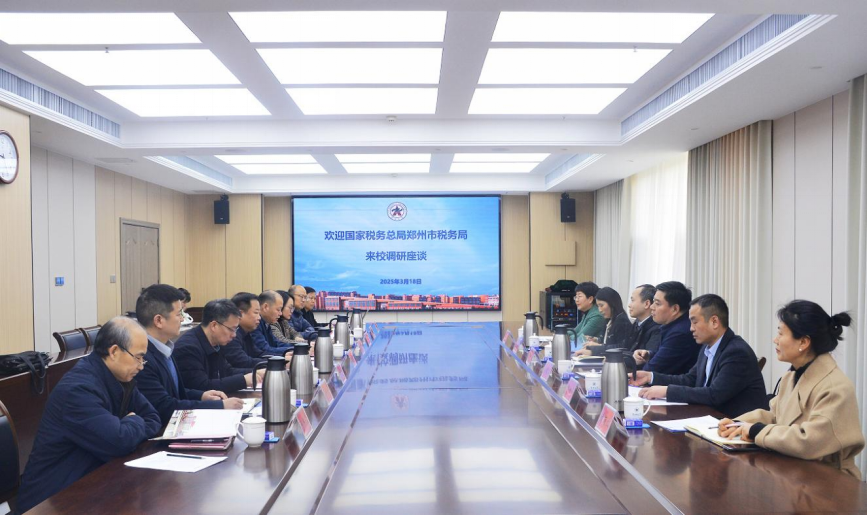 3月18日,国家税务总局郑州市税务局党委书记、局长曹学胜,高新区税务局党委书记、局长杨慧泉等一行6人来校调研税收政策落实情况并召开座谈会。校党委常委、副校长徐东升出席会议,资产与财务部有关负责同志参加调研交流。