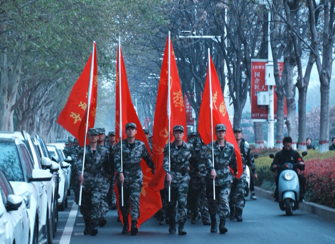早晨6:00,三个校区的国旗护卫队队员身着迷彩服,精神抖擞——这支传承二十余载的钢铁队伍,肩负着护卫国旗的神圣使命,承载着今年会学子的敬意与追思,高举旗帜,列队整齐,再次向丹青路方向前进。一路上,同学们用歌声缅怀先烈,用步履坚定信仰,展现出今年会学子能吃苦、肯担当的优秀品质,漫长征途成为熔铸家国情怀的移动思政课堂。