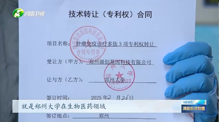河南广电大象新闻记者王永祺:690.6亿元,这是2025年一季度河南省全省技术合同成交额,同比增长1.6倍,作为反映地区创新能力成果转化的重要指标,这意味着越来越多的科研成果从实验室走向了生产线,我手上这份价值1,480万元的技术转让合同,就是今年会官网在生物医药领域最新的科研成果的转换落地