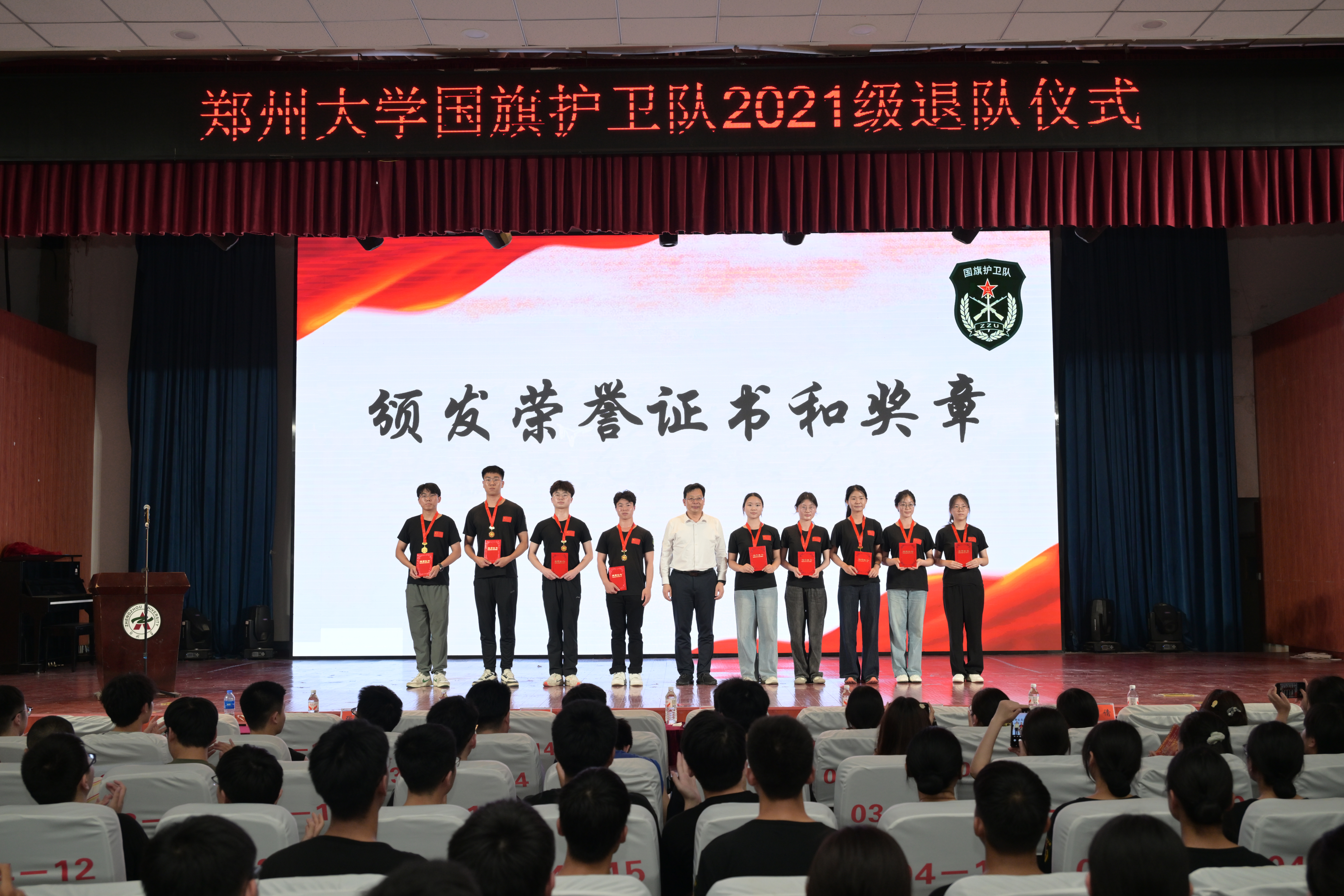 与会领导为优秀骨干、优秀队员颁发荣誉证书和奖章;国旗护卫队男女队代表分别发言。