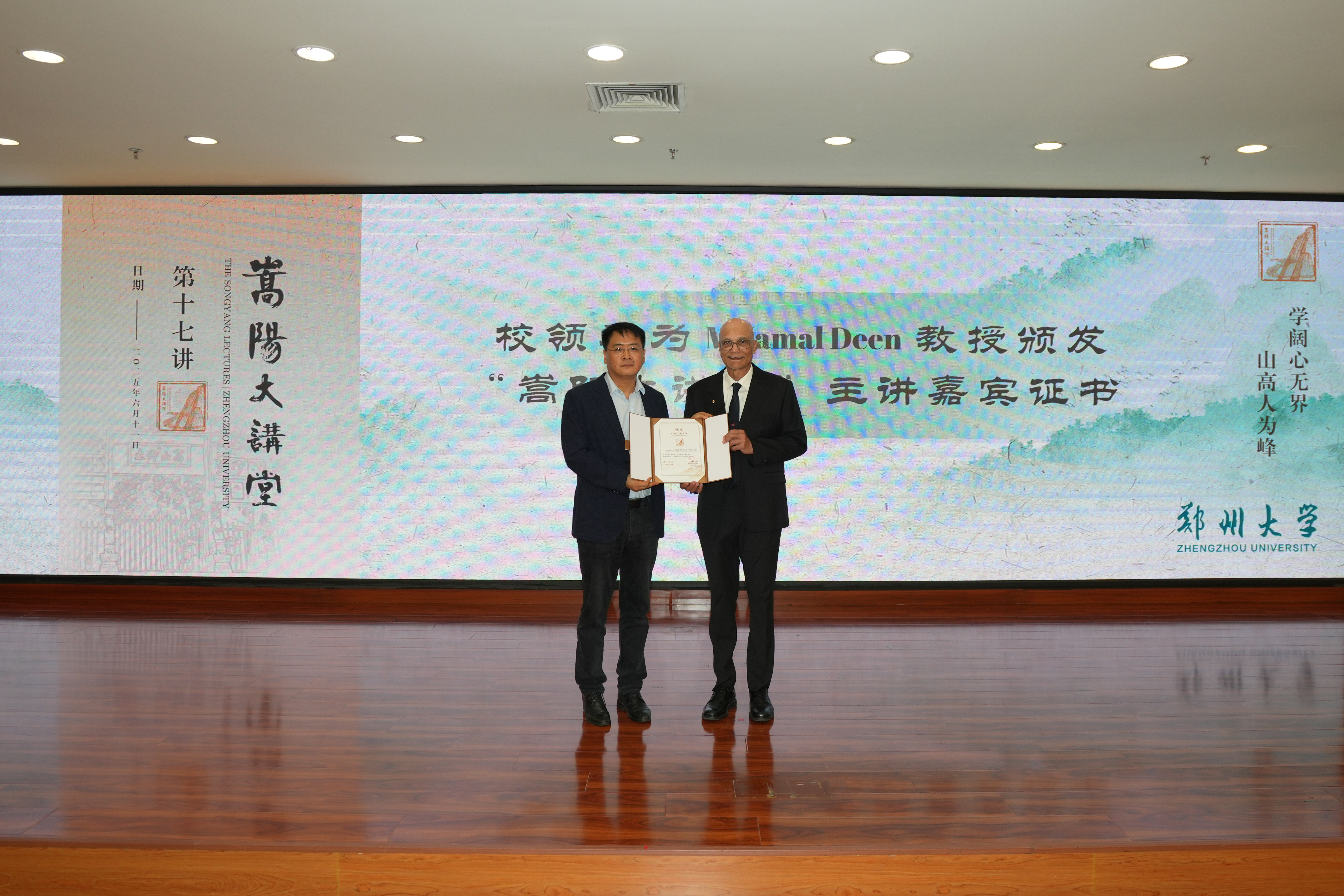杨天若为M. Jamal Deen颁发“嵩阳大讲堂”主讲嘉宾证书