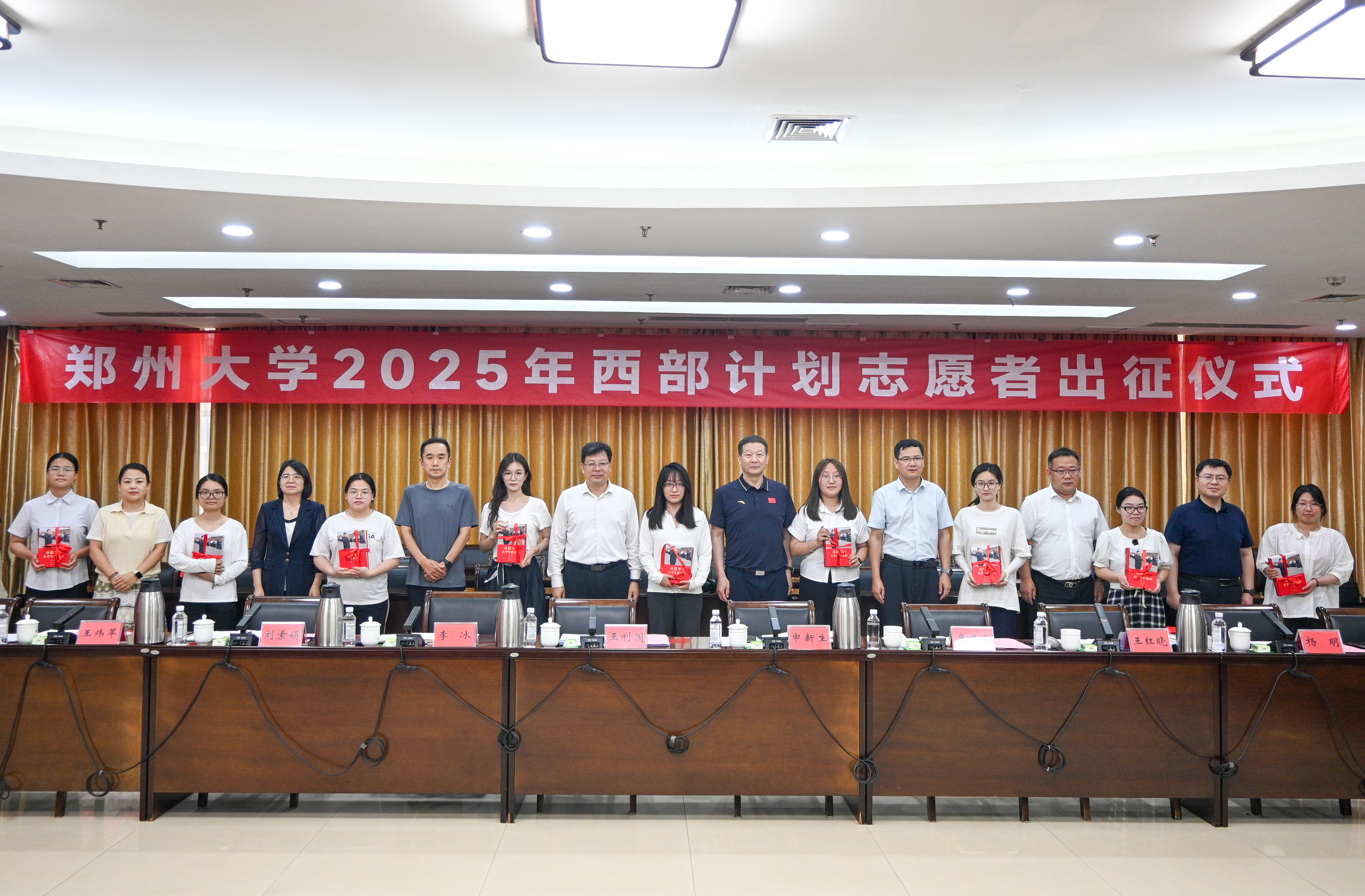 会上,四名即将前往不同服务地的西部计划志愿者和研究生支教团代表分别发言。王利国为各支教队授旗。与会领导向志愿者赠送书籍。