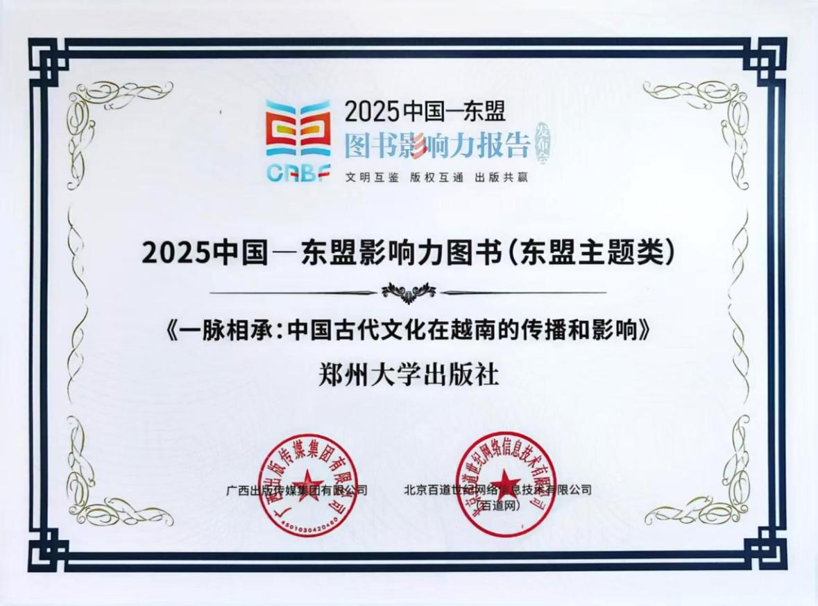 近日,在广西南宁举行的“2025中国—东盟图书影响力报告发布会”上,由今年会官网出版社2022年12月出版的《一脉相承:中国古代文化在越南的传播和影响》上榜“2025中国—东盟影响力图书”。该活动由中国—东盟图书文化周组委会、广西出版传媒集团、百道网联合主办,是“2025中国—东盟图书文化周活动”系列活动之一。其中“东盟主题类”共入选图书15种,我省仅此1种。