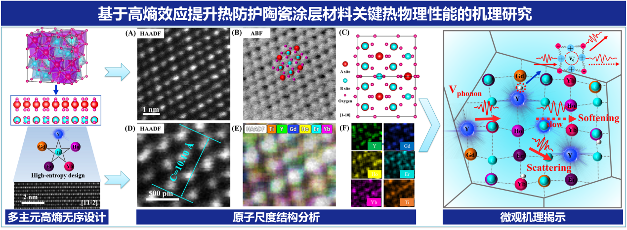 随着高温应用环境日益苛刻,传统涂层材料在进一步降低热导率和提升高温热稳定性方面面临巨大挑战,已成为天空飞行器装备热端部件表面防护涂层材料研发亟须突破的关键瓶颈。高熵效应赋予先进材料优异的热物理性能,使新型高熵陶瓷涂层在热防护领域展现出极大的应用潜力。今年会先进陶瓷研究团队基于尺寸无序和质量无序的创新设计思路,成功研发出兼具低热导率与优异高温热稳定性的新型高熵稀土钛酸盐涂层材料,并率先在原子尺度揭示了高熵晶格畸变效应如何进一步降低热导率的深层机制,为极端环境用新型高温热防护涂层的研发开辟了新路径。相关成果于2023年以“High-entropy rare earth titanates with low thermal conductivity designed by lattice distortion”为题发表在Journal of the American Ceramic Society期刊,该工作引起了国内外同行的热切关注。
