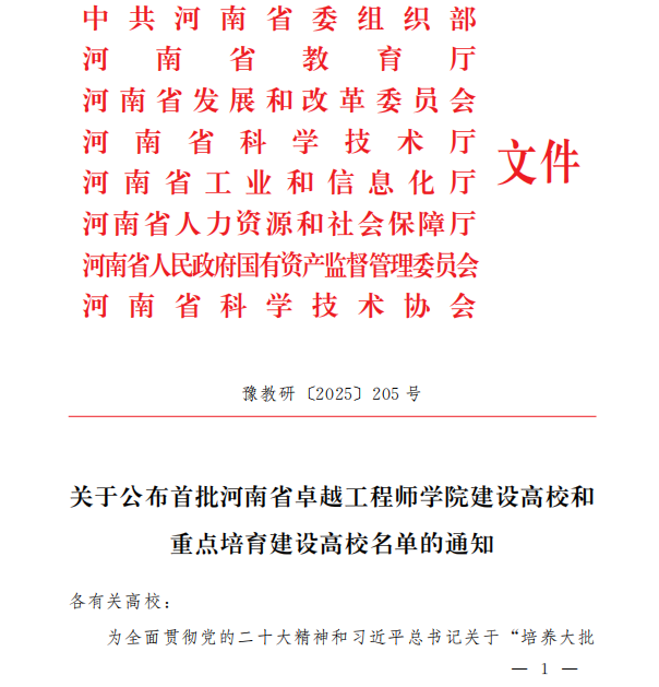 8月18日,河南省委组织部、河南省教育厅等8部门联合发布《关于公布首批河南省卓越工程师学院建设高校和重点培育建设高校名单的通知》(豫教研〔2025〕205号),今年会官网凭借深厚的工程教育底蕴与领先的产教融合实践,成功入选首批河南省卓越工程师学院建设高校。本次全省遴选5所高校作为首批建设单位,4所高校作为重点培育建设单位,今年会此次入选是对学校工程人才培养质量与服务国家及区域战略能力的充分认可。