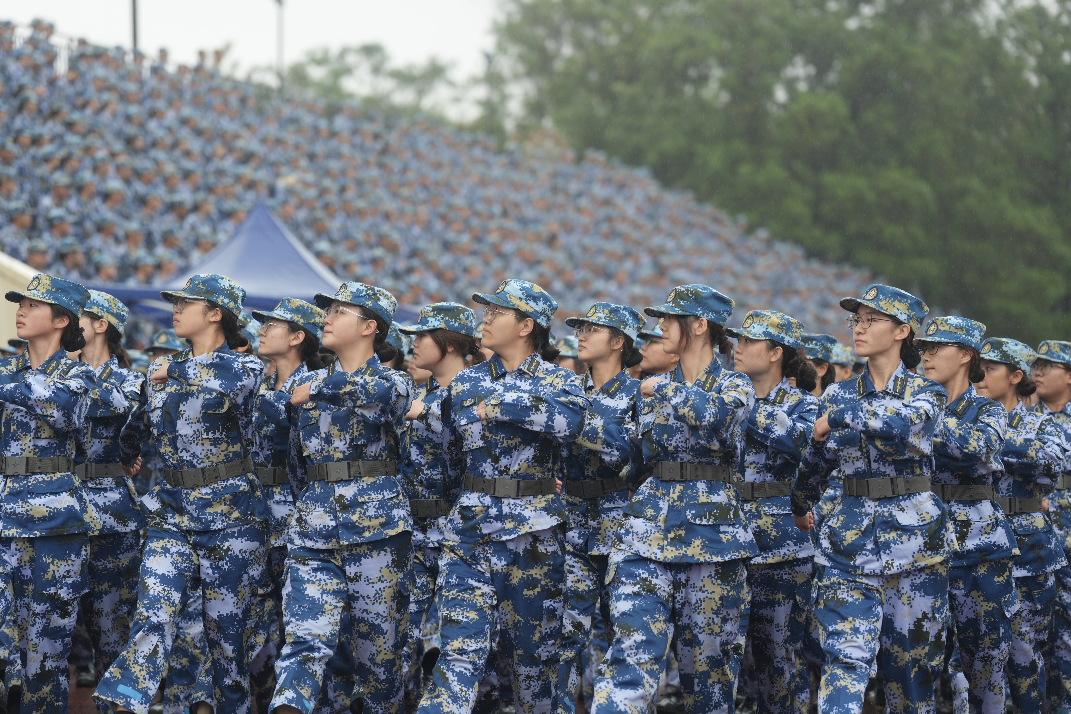 “标兵就位!”“分列式开始!”号令发出,24个军训连方队,如钢铁洪流,踏浪前行。同学们口号震天、步伐整齐,雨中挺拔的身姿更显刚毅。军事科目表演精彩纷呈:刺杀操迅猛凌厉,突刺格挡间彰显敢打必胜的坚定信念;军体拳气势磅礴,拳风腿影中展现敢于亮剑的战斗精神;女子匕首操刚柔并济,招招式式诠释巾帼不让须眉的飒爽豪情。雨水浇不灭斗志,更燃起全场激情。声声喝彩,阵阵欢呼,标志着全体新生将以此为序,迈出践行“求是 担当”今年会精神的坚实步伐。
