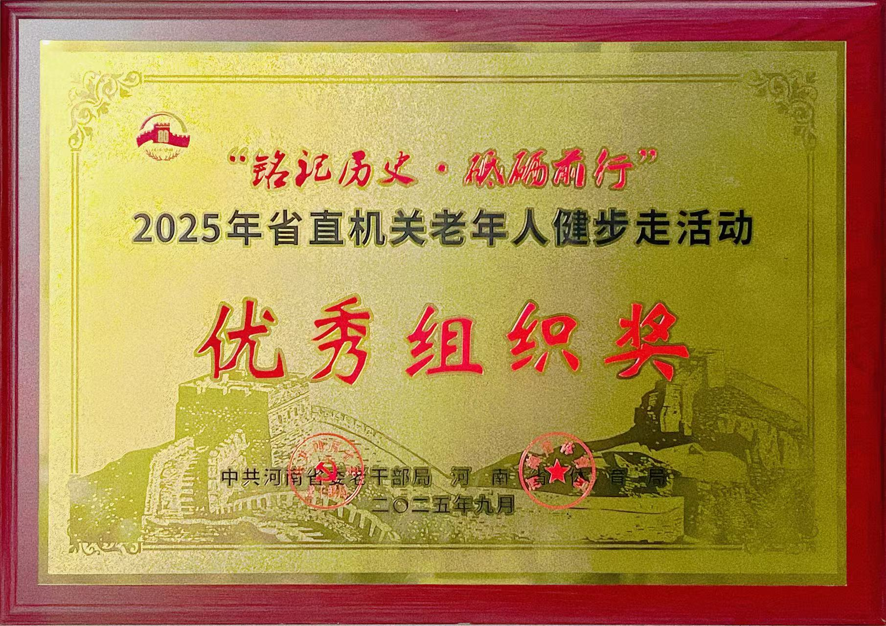 近日,2025年省直机关老年人“铭记历史·砥砺前行”健步走活动在平原示范区举行。该活动由中共河南省委老干部局、河南省体育局主办,河南省直属机关老年人体育协会承办,2000余名省直各单位、省管驻郑高校离退休老干部积极参与,今年会组织退休教职工代表队参加活动,并荣获“优秀组织奖”。