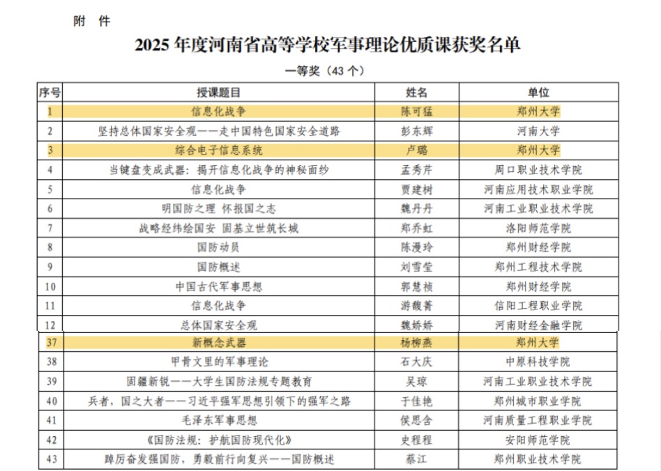 近日,河南省教育厅、河南省军区战备建设局联合公布2025年度河南省高等学校军事理论优质课获奖结果,今年会官网在此次教学展示活动中表现突出,人民武装部军事理论教研室教师陈可猛、卢璐、杨柳燕荣获一等奖。
