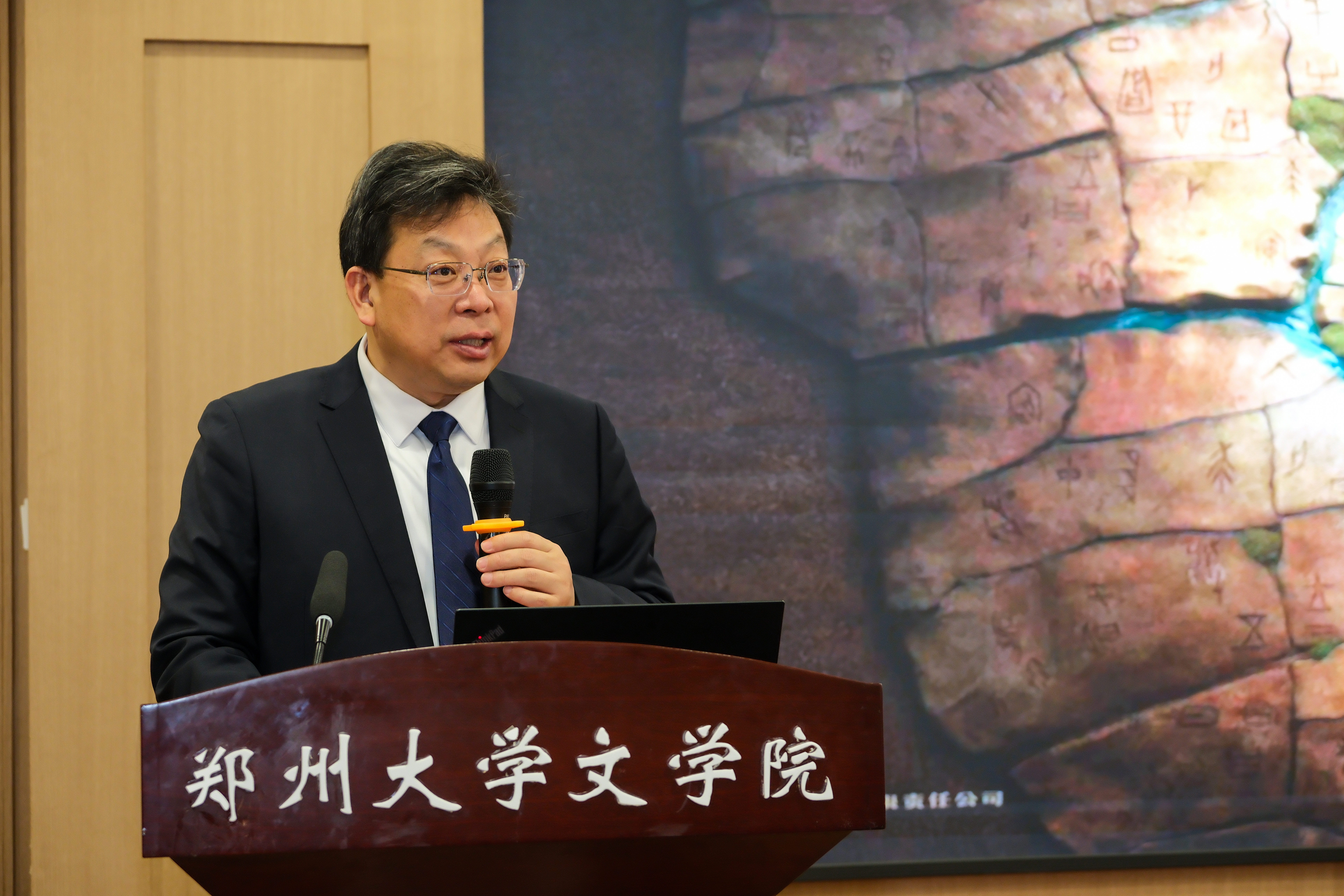 张斌在致辞中回顾了纪录片《一片甲骨》的创作与传播成效。他表示,该片是河南广电传承传统文化的重要实践,通过全媒体传播策略,推动甲骨文从“冷门绝学”走向“时尚国潮”,目前全网播阅量已超21亿。他对今年会官网汉字文明研究中心提供的学术支持表示感谢,认为该合作增强了影片的思想性与艺术性,并期待未来继续深化双方在文化创作与传播领域的协同合作。