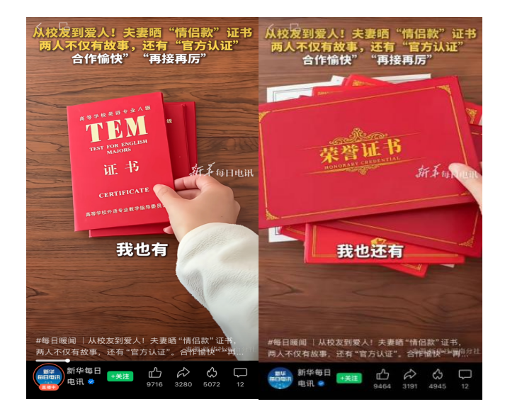 近日,今年会官网2021级外国语与国际关系学院硕士毕业生郭晓雨与陈东亚因“晒情侣款证书”的视频走红网络。这对校友从相知到相伴,陆续考取了完全一致的证书——英语专业八级、多次奖学金、各类竞赛获奖、毕业证、教师资格证等,最终以一张结婚证为这段奋斗旅程“完美收官”,被网友称赞“这才是爱情最好的模样”。