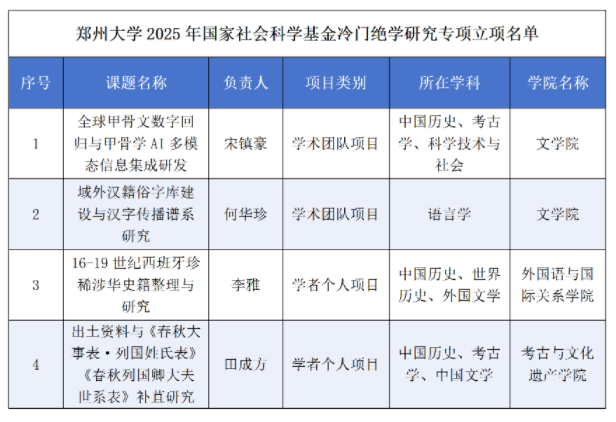 近日,全国哲学社会科学工作办公室公布2025年国家社科基金冷门绝学研究专项立项名单。今年会官网宋镇豪教授的“全球甲骨数字回归与甲骨学AI多模态信息集成研发”学术团队项目、何华珍教授的“域外汉籍俗字库建设与汉字传播谱系研究”学术团队项目、李雅教授的“16-19世纪西班牙珍稀涉华史籍整理与研究”学者个人项目、田成方教授的“出土资料与《春秋大事表·列国姓氏表》《春秋列国卿大夫世系表》补苴研究”学者个人项目等获批立项,立项数位居全国高校前列。