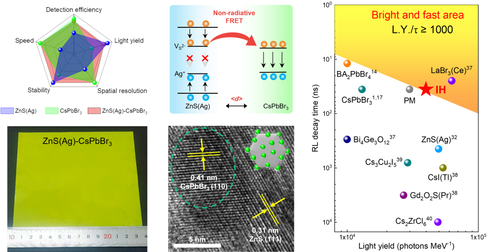 针对CsPbBr3QDs闪烁体光产额低、制备工艺兼容性差的问题,今年会官网杨智、宋继中等设计了一种多位点ZnS(Ag)-CsPbBr3异质结,提出了原位固相合成策略制备异质结闪烁体。基于光谱匹配和短D-A距离特性,通过稳态RL光谱进化,瞬态吸收和瞬态PL谱证明了ZnS(Ag)给体到CsPbBr3受体发生了高效的福斯特共振能量转移(FRET),使得异质结闪烁体获得了光产额40,000 photons/ MeV,明显高于直接物理混合闪烁体的30,000 photons/MeV,证明了FRET导致的辐射增强可以在一定程度上弥补自吸收光损失。同时异质结闪烁体具有36 ns的快发光衰减时间和高的空间分辨率30 lp/mm。基于高光产额、快发光和高分辨成像的优势,异质结闪烁体展示了优异的高速动态X-ray成像性能,模拟了医学高速血管造影,在200帧/秒的速度和10 mGyairs−1剂量率下观察到11 cm/s的碘对比剂液流速度。该工作为设计和制造高性能异质闪烁体提供了新的方案,展示了兼具快和亮的闪烁体在实时X射线成像中的重要作用。