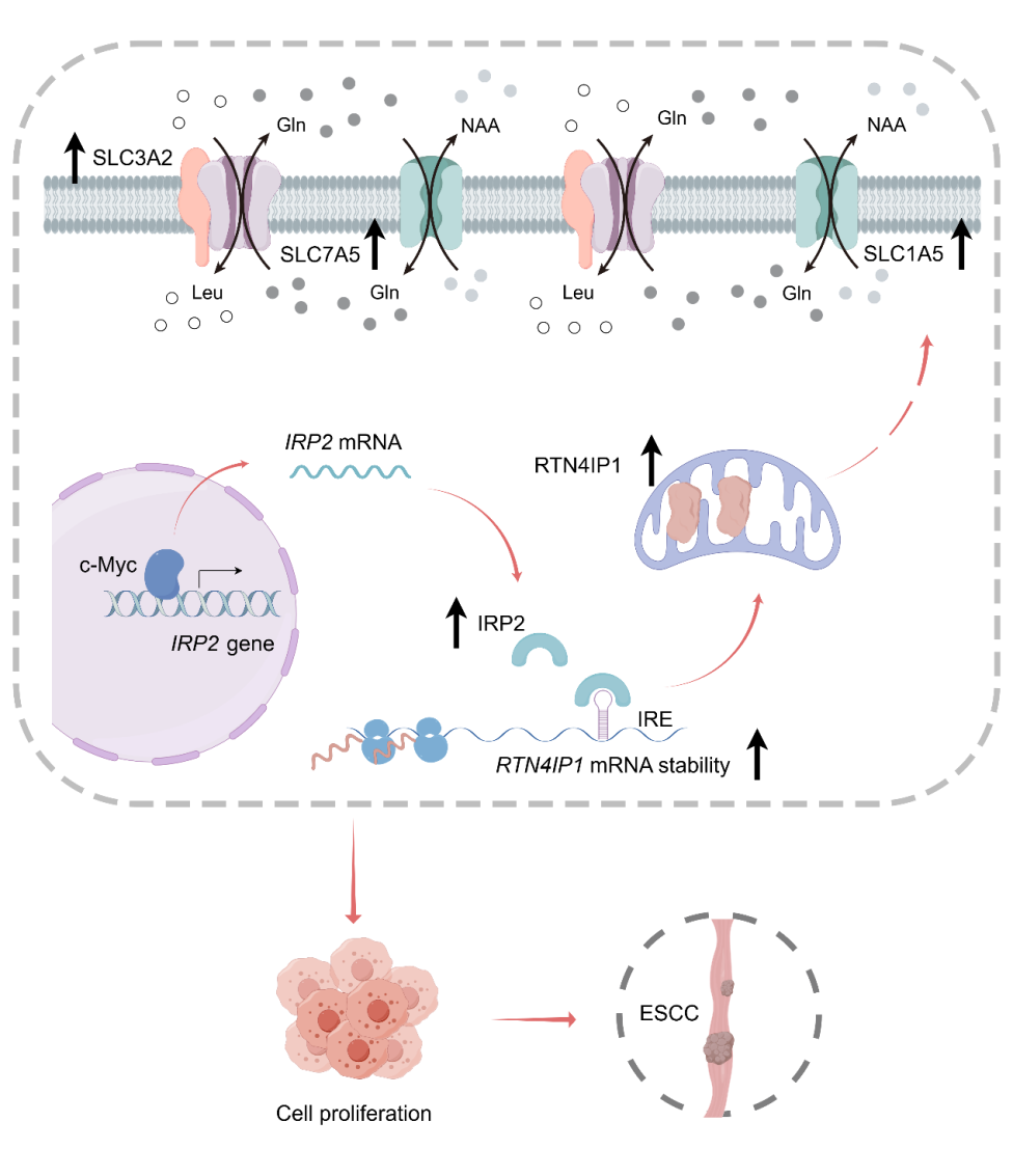 机制图:c-Myc-IRP2介导的RTN4IP1高表达促进食管癌肿瘤细胞摄取外源氨基酸