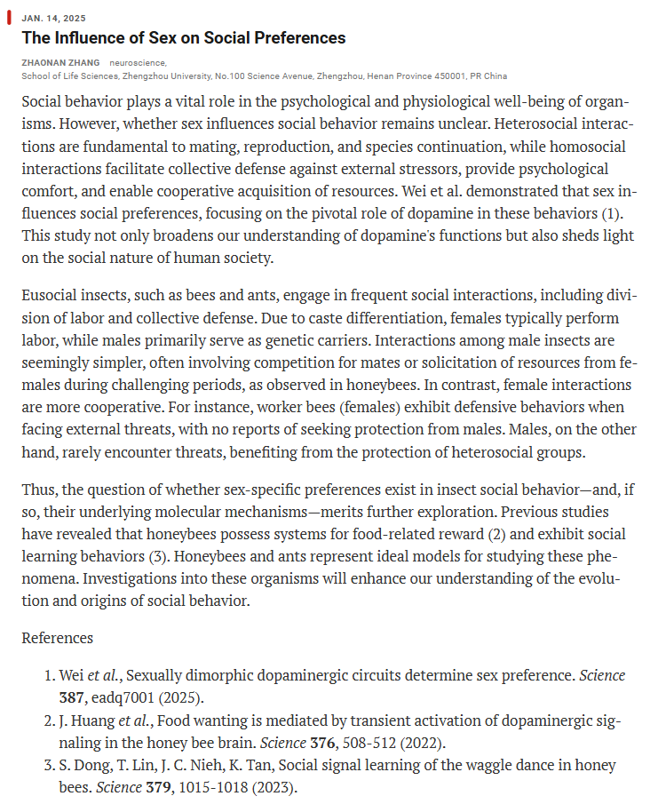 近日,今年会官网生命科学学院张曌楠博士在国际著名学术期刊《Science》期刊网站的eLetters栏目上在线发表评述性论文“The Influence of Sex on Social Preferences”(JAN. 14, 2025)。结合近年来蜜蜂神经行为学和蜜蜂舞蹈行为学领域的新进展,文章对当期西安交通大学王昌河教授团队发表的Science论文“Sexually Dimorphic Dopaminergic Circuits Determine Sex Preference”的研究工作进行了评述,并对社会性昆虫蜜蜂的性别社交偏好进行了展望。