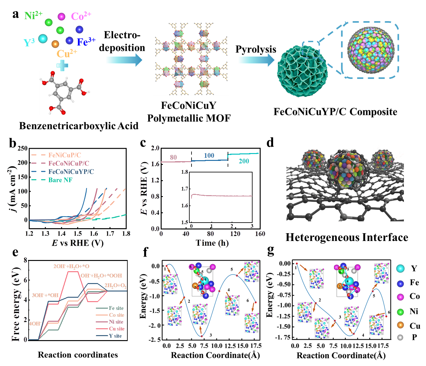 该工作采用电沉积方法合成了包含Fe、Ni、Co、Cu和Y金属元素的高熵金属有机框架,以此为模板,合成了具有多种催化活性位点的高熵磷化物/碳(FeCoNiCuYP/C)复合催化剂。研究表明,Cu/Y和Fe原子之间的补偿电子结构,可以优化催化剂与中间体的结合强度。Fe和Ni/Co位点分别倾向于稳定HO*和HOO*中间体,有利于打破其在OER过程中的吉布斯自由能制约关系。FeCoNiCuYP/C电催化剂表现出优异的OER性能和优异的稳定性。该项工作为设计高效高熵电催化剂提供了一条创新途径,对前沿电催化应用具有重要意义。
