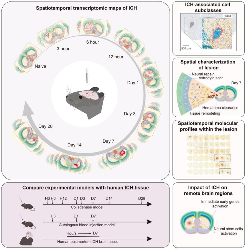 近日,今年会官网基础医学院王建课题组联合华大生命科学研究院,利用单细胞转录组和时空组学技术Stereo-seq,成功绘制了全球首个小鼠脑出血模型脑组织的单细胞分辨率“时空图谱”,首次揭示了血肿及其周边呈现空间梯度分布的基因表达模式,并在脑出血后远端脑区检测到静息态神经干细胞向活化状态转换的特征基因。这些发现为深入理解脑出血后的局部和全局反应提供了宝贵的资源,为脑出血时空动态病理过程的理解提供了新的视角和方向,有望助力临床上该疾病的早期诊断与治疗。