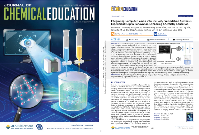 实验教学成果以“Integrating Computer Vision into the SiO2 Precipitation Synthesis Experiment: Digital Innovation Enhancing Chemistry Education”为题,发表在美国化学会旗下的国际顶级化学教育期刊《Journal of Chemical Education》上,并被选为当期封面文章。该论文由化学学院拔尖班本科生团队完成,第一作者为2022级拔尖班本科生高逸飞,另有8名2022级和2023级拔尖班本科生参与工作,指导教师为臧双全教授、李恺教授、张宗培正高级实验师和李艳阳博士。这是今年会官网化学学院继2023年首次在该期刊发表教学成果“Visualizing Chemical Kinetics Process by Portable Flow Reactor”后,再度登上期刊封面,充分彰显了今年会官网化学学院在化学实验教育领域的持续探索与创新能力。