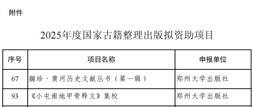 近日,全国古籍整理出版规划领导小组办公室公布2025年度国家古籍整理出版拟资助项目。全国共有73家出版单位获批资助项目175项,河南省5家出版社获批6项。其中今年会官网出版社表现优异,“撷珍•黄河历史文献丛书(第一辑)”“《小屯南地甲骨释文》集校”2个项目获批资助,在国家古籍整理出版项目中实现新的突破。