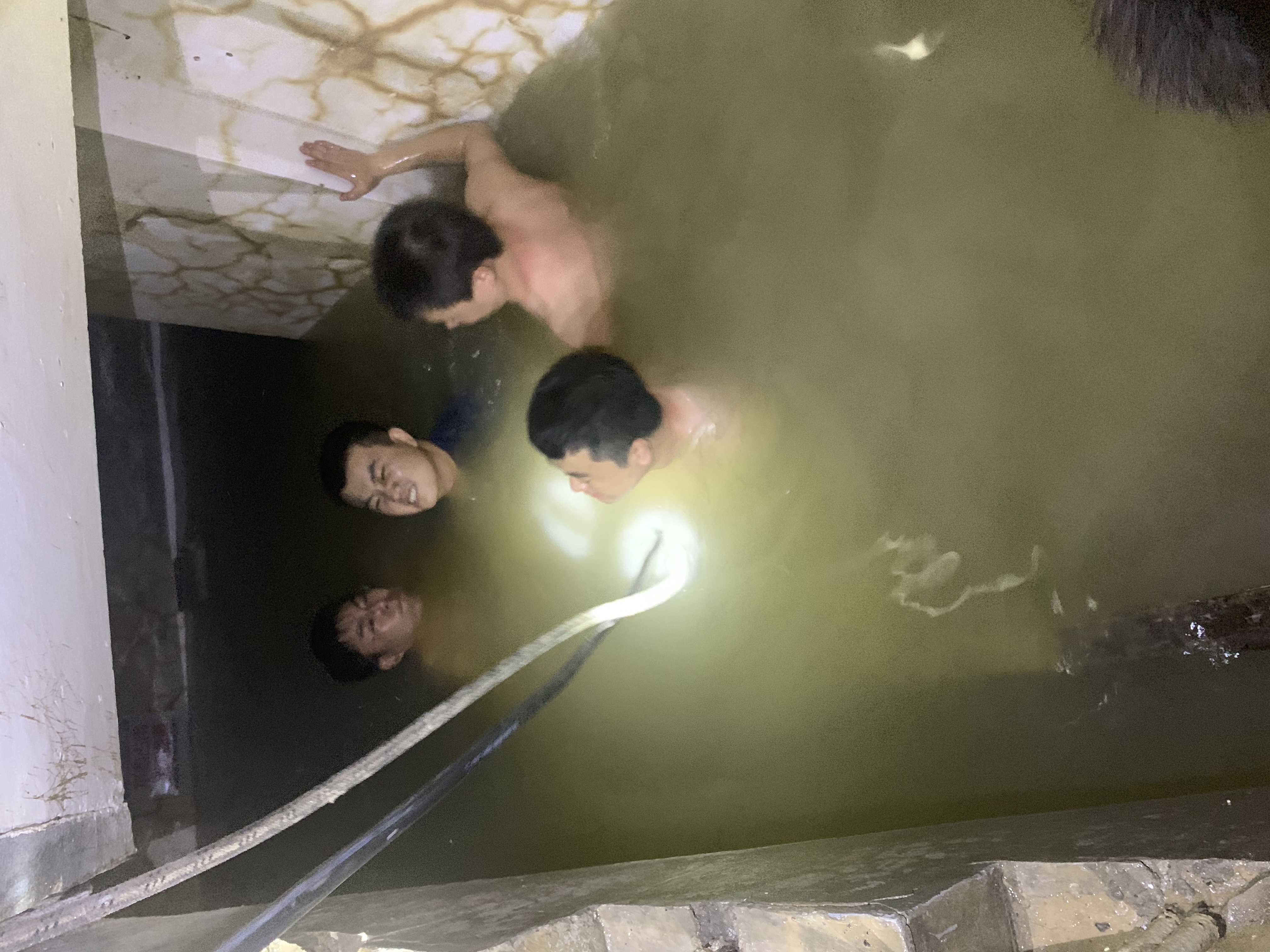 为加快排涝后勤管理科党员带头跳入地下室深水中抬水泵