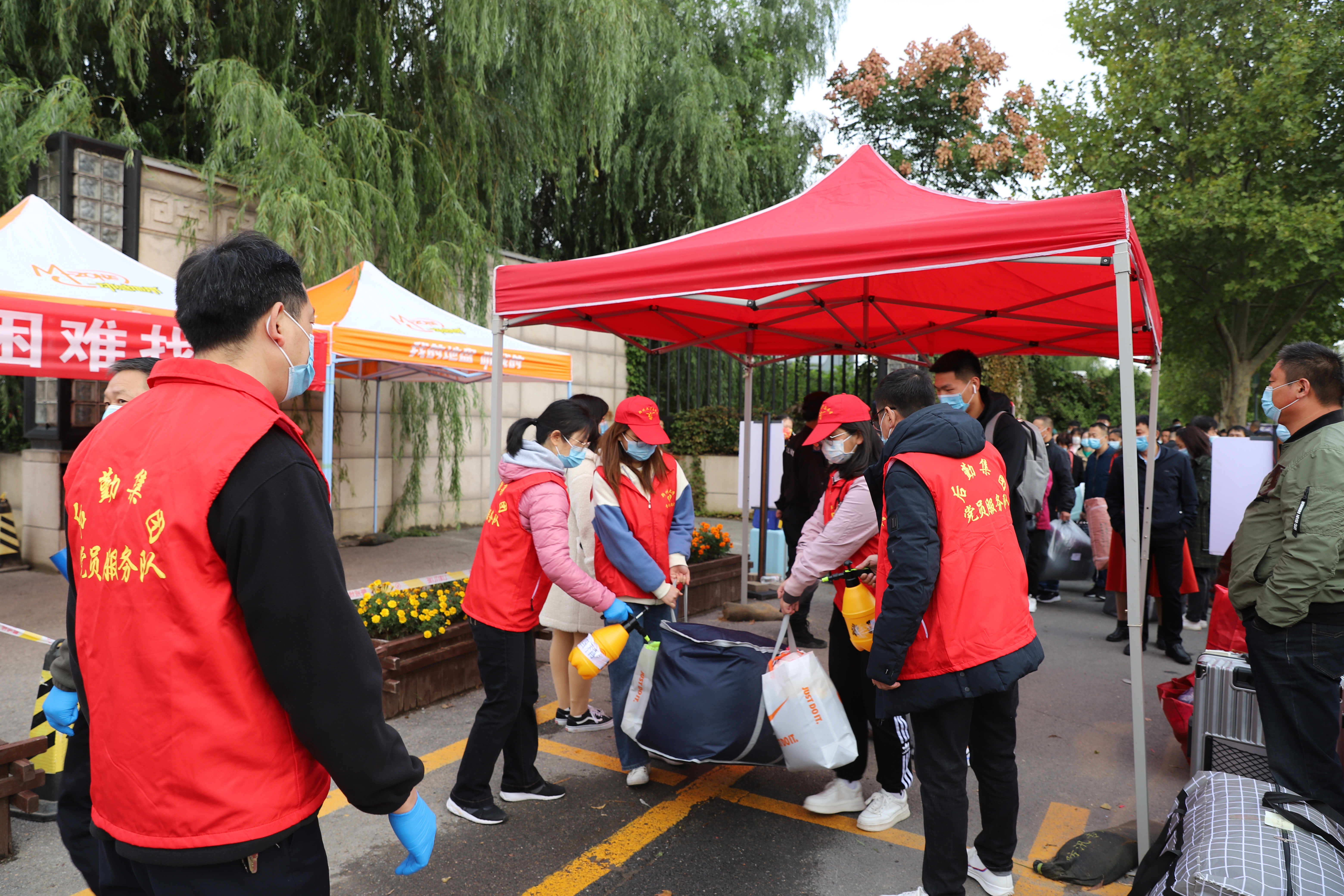 党员志愿服务是彰显和传递“红色正能量”的重要举措,为了做好这项工作,服务队员克服家庭、疲劳等困难,用坚守和担当展现出了后勤集团的党员风采。后勤集团党员消杀服务队守在四校区校门口,负责对学生行李的消杀工作,工作时间是早7点到晚11点。共产党员董旭霞负责主校区东门的消杀工作,16日晚上9点半时依然坚守在岗位上。由于没见到妈妈,她2岁半的孩子在家里哭闹的异常厉害。无奈之下,婆婆带着孩子来到学校东门口,看到妈妈后,孩子瞬间转哭为笑。共产党员张文跃是火车站迎新点的志愿者,面对深秋的寒夜,他主动要求值夜班。从15日晚上11点到16日下午1点,张文跃一直守在岗位上。当问他是否瞌睡时,他回答道:“上午新生来的比较多,光顾上忙了,没顾上瞌睡”。这已经是张文跃第8年参与火车站的接新生工作。共产党员张勤学负责主校区南门内车辆调度、行李搬运等工作。16日当天,他为新生往摆渡车上搬运行李1100余件,一天下来浑身酸疼。为落实“移动气泡法”精准管控人员,学生返校核酸检测后,须在宿舍等待核酸结果,期间由后勤集团党员服务队负责送餐,确保在观察期的同学们吃上热腾腾的可口饭菜。“早上5点装盒,6点半开始送餐”,服务队员程松说,“我们送给学生的不仅是盒饭,还有后勤集团的温暖和关爱。”