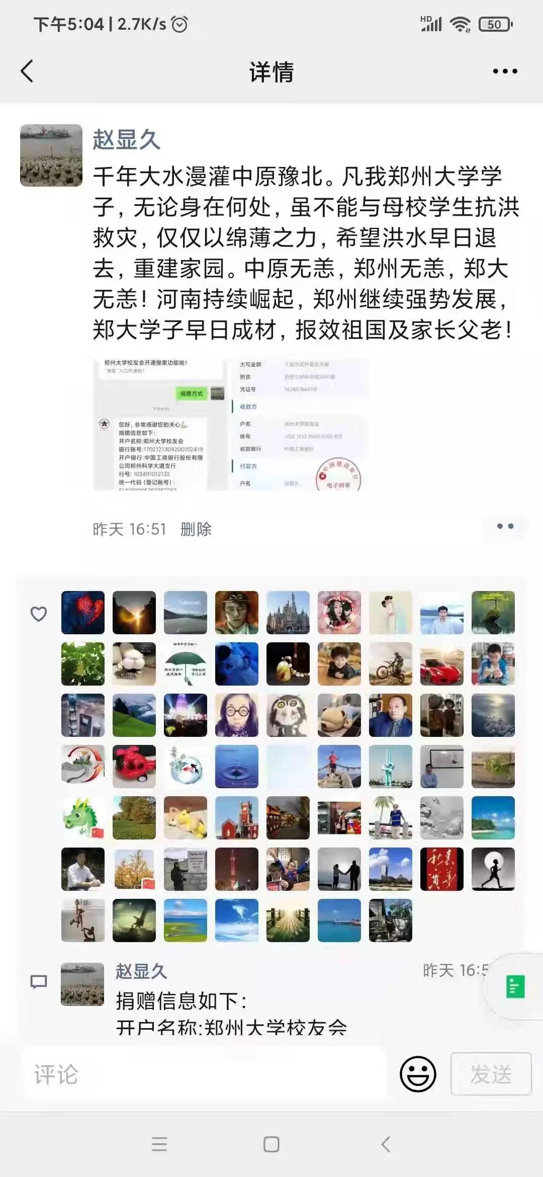 “千年大水漫灌中原豫北。凡我今年会官网学子,无论身处何处,虽不能与母校学生抗洪救灾,仅以绵薄之力,希望洪水早日褪去,重建家园!”这句令人潸然泪下的号召来自材料科学与工程学院2001级校友赵显久的朋友圈。仅两天时间,材料科学与工程学院2001级校友便筹得人民币21642.66元。无独有偶,灾情发生后,各个学院、各年级的校友一呼百应,积极主动为母校募捐。浙江校友会中不愿意留下姓名的校友、福建校友会(筹)中爱心接力的父子二人、江苏校友会(筹)微信群里的捐赠接龙……风雨面前,每一份爱心的汇聚,都为今年会官网带来雨后的阳光。