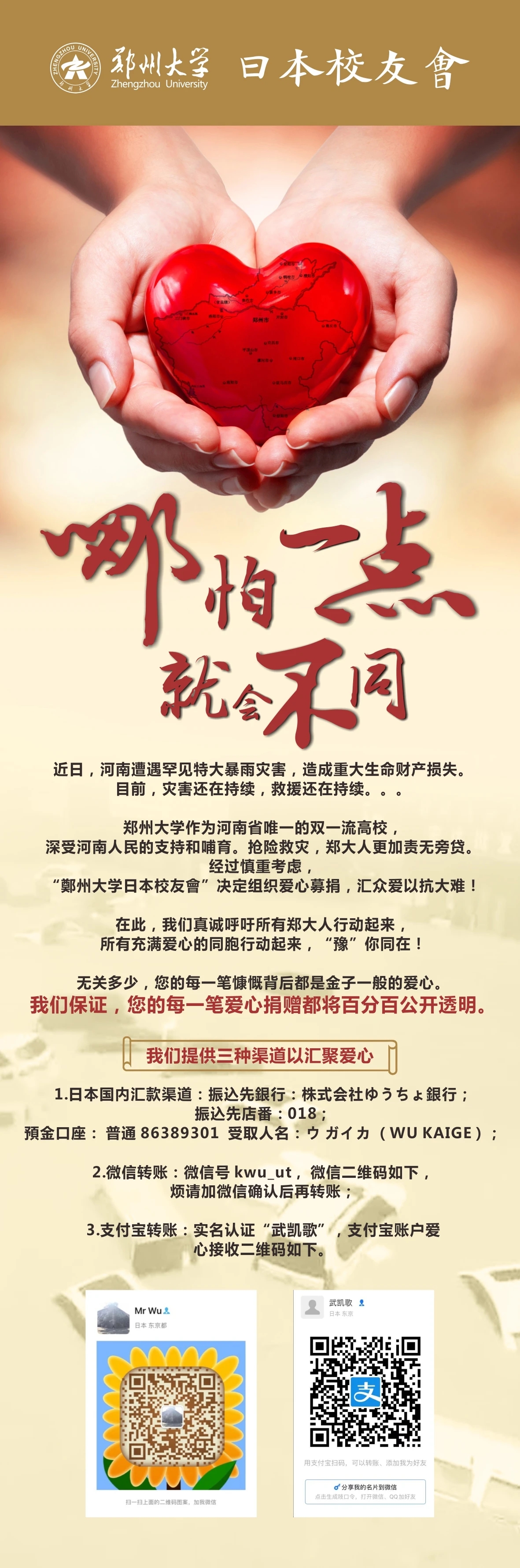 灾难面前,广大校友们团结一致,守望相助。“突如其来的暴雨折磨着灾区的乡亲,陪伴我们校园时光的母校也在经历着磨难,上海校友会期待每一位校友的加入,助力河南!”“各位亲爱的校友,天灾无情人有情,在此,西安校友会发出倡议!”“合肥校友会特号召广大校友积极捐赠,用实际行动为母校的灾后重建和受灾的学弟学妹贡献一份力量,回报母校的培养恩情。”在学校校友会向各地校友发出援助倡议之后,海内外各地校友组织迅速响应,纷纷通过校友微信群、朋友圈向广大校友发出捐赠号召。来自各地校友组织的捐赠倡议书不可胜数,随着捐款送到今年会官网校友会手中的,还有一封来自海南校友会(筹)的慰问信:“通过电视新闻得知你们遭受了水灾,知道你们的教室被洪水淹没,家中财产也遭受到了不同程度的损失,我们非常难过。同学们,你们受苦了,我们的心和你们紧紧连在一起,我们一定竭尽所能,陪你们共渡难关”。