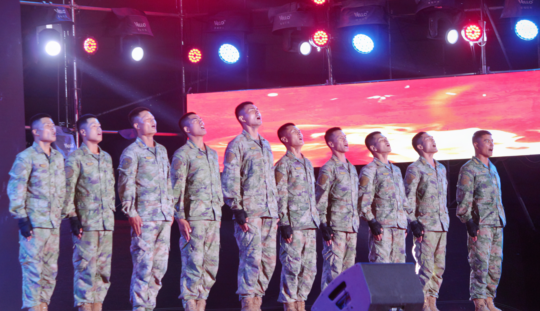 灯光变换,光影交替,舞台归于黑暗。灯光再度亮起时,十位军训教官出现在舞台上。侧踢腿、出拳、砸拳、劈掌、卧倒,伴随着铿锵有力的音乐,一套动作行云流水、舒展自如,引得台下新生鼓掌声连连、喝彩不断。歌伴舞《奔跑的青春》活力四射,正如歌词“极速青春里每一分每一秒都不想停歇”,晚会也处处洋溢着青春与活力的气息。美术学院2023级新生张笑和卢子琪激动地表示:“晚会太盛大了,现场很燃,气氛特别好!而且能够感受到学校对我们的重视,晚会举办得很用心。”