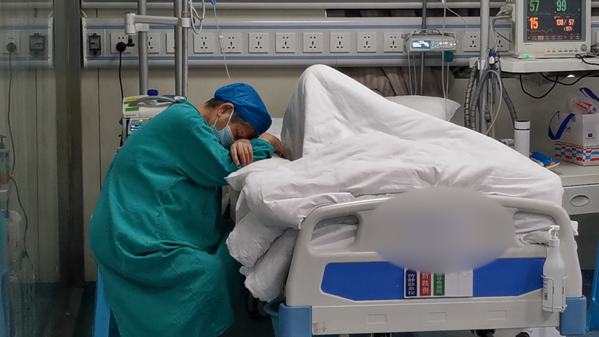在重症病区有一位33岁的小伙子,全身插满各种监测用的管子,他在来ICU前已经做过肾移植手术。医生告诉记者,这名小伙子患有严重肾衰竭并且合并消化道穿孔,在重症监护室住了将近一周,他的家人不放心小伙子病情,就睡在了病区门口的椅子上,“一天一夜都在这儿坐着、守着,已经第四天了。”