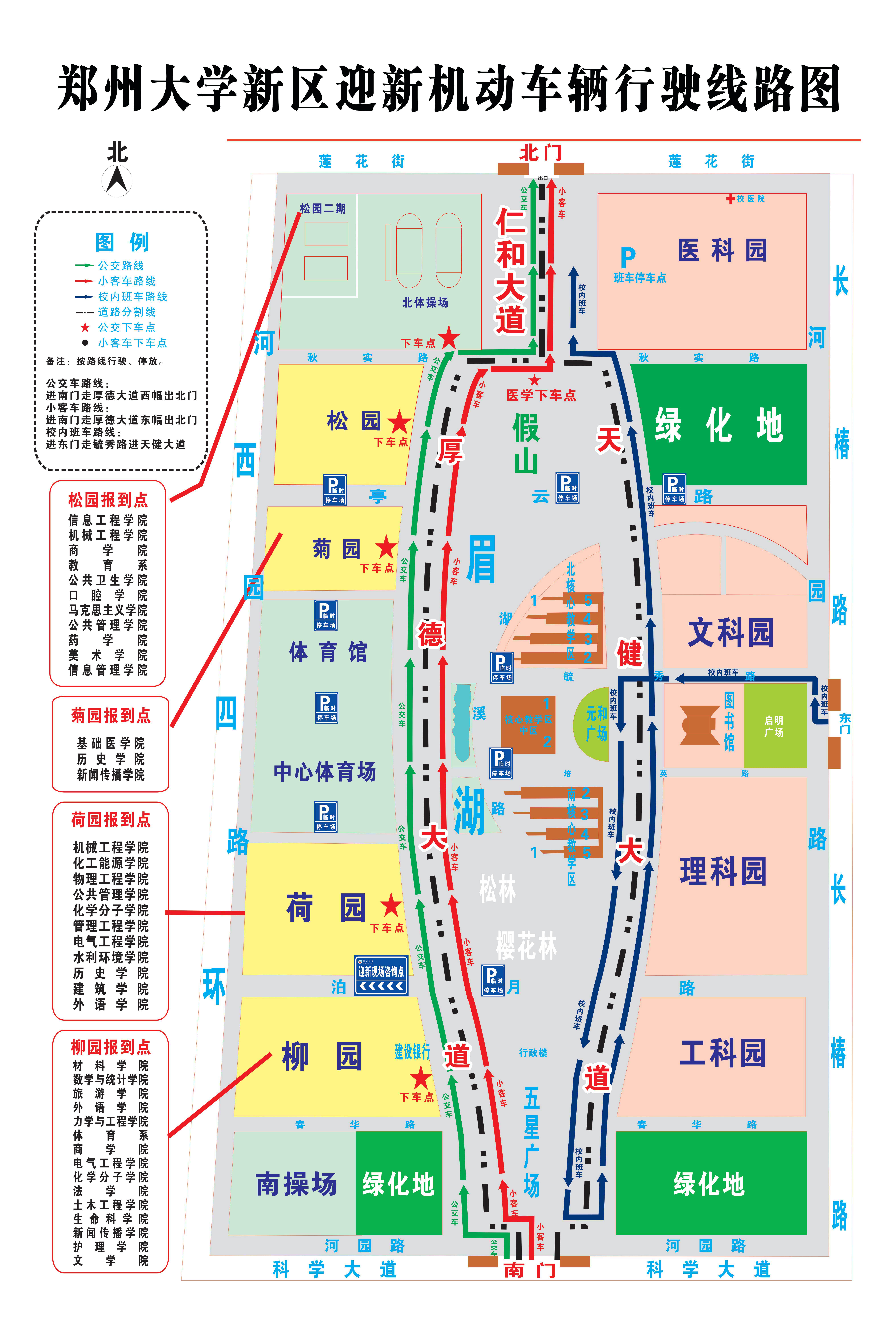 2.接新生的大巴车、校内小公交进入主校区南门后向左转,沿厚德大道西幅向北途径柳园、荷园、菊园、松园下车点至秋实路右转经仁和大道出北门。