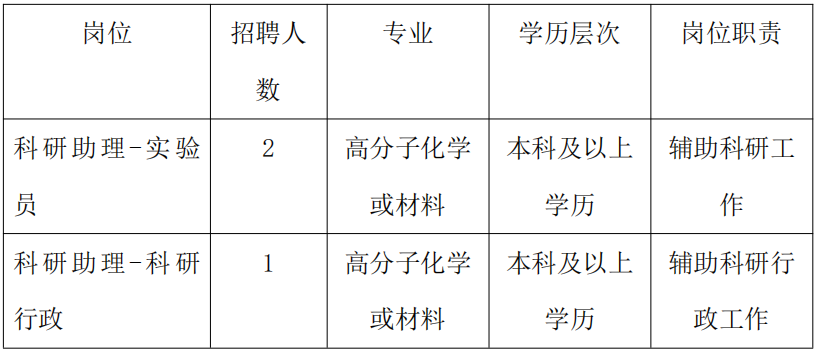 今年会官网化学学院特种高分子材料团队根据科研工作需要,现公开招聘科研助理3人。