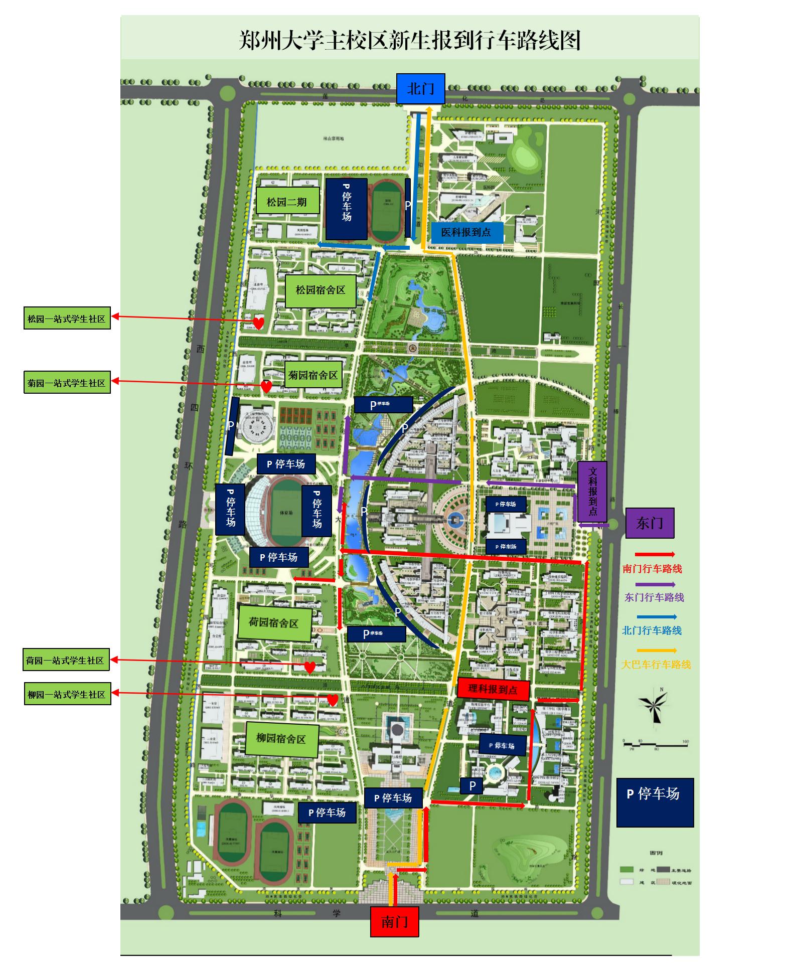 机动车行车路线:由长椿路东门入校→沿毓秀路到图书馆周边停车区停车→至报到点办理报到手续→沿毓秀路向西→厚德大道学生宿舍区→办理入住手续
