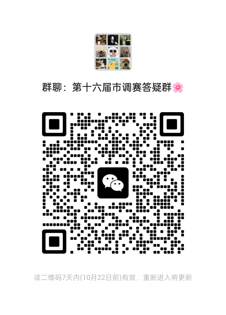 为便于赛事期间信息传递与问题解答,现已建立官方微信群。请参赛选手扫码入群,入群后请立即修改群昵称为[学院-真实姓名-联系电话]。若扫码无法入群,请先添加工作人员微信(Jia824460或yh15239011087),随后工作人员会邀您入群。